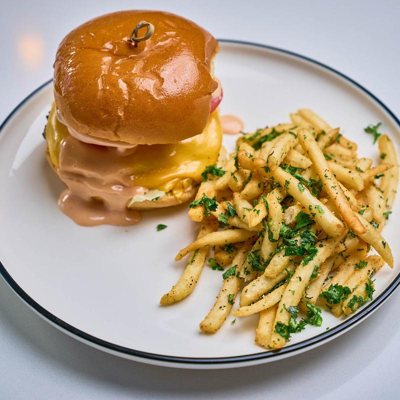 Diner style patty, shaved lettuce, tomato, onion, pickles, American cheese, Momo sauce, martin’s bun | Add patty $3