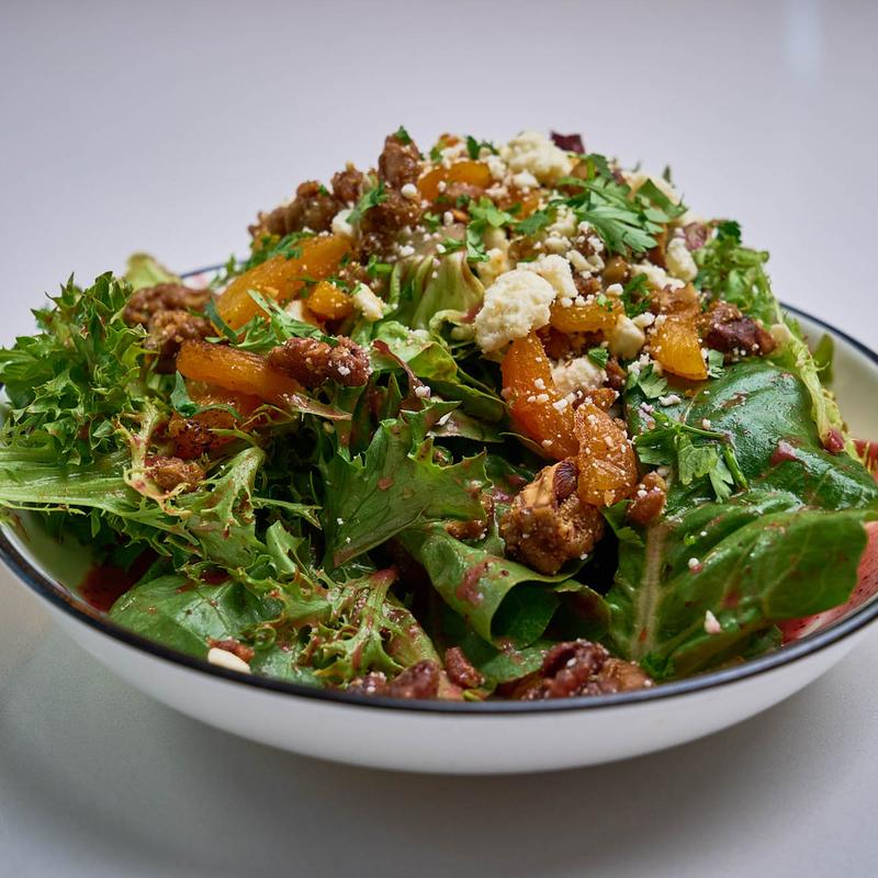 Artisan lettuce, charred apricot, candied walnut, feta, blueberry-basil vinaigrette